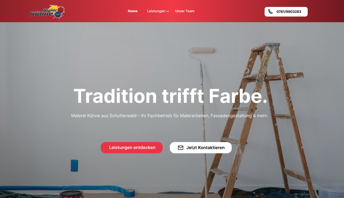 Webdesign für eine Maler-Website mit klarem Fokus auf Vertrauen, Übersichtlichkeit und professionellem Auftritt. Struktur, Typografie und Nutzerführung wurden gezielt auf Seriosität und Benutzerfreundlichkeit ausgerichtet.